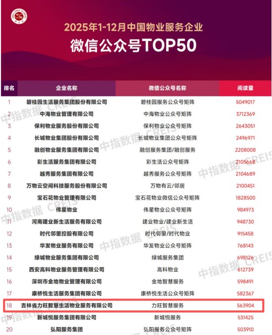 l 微信公众号跻身“2025年1-12月中国物业服务企业微信公众号TOP50”第18名,阅读量达563904。