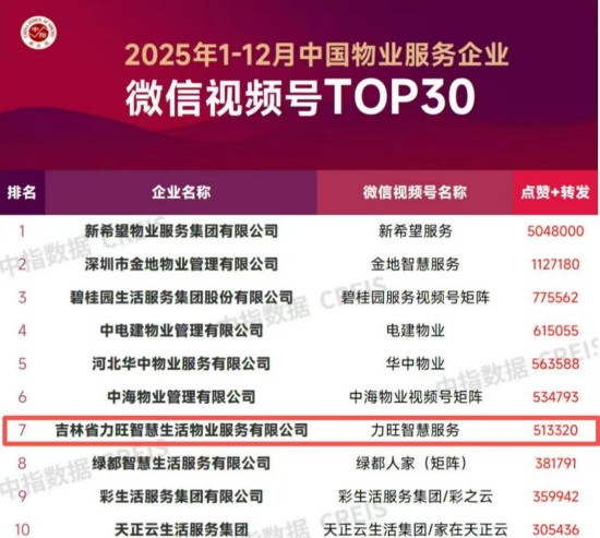 l 微信视频号位列“2025年1-12月中国物业服务企业微信视频号TOP30”第7名,点赞+转发量达513320。
